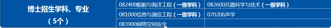 航海学院硕士招生学科专业10个(7学术型、3个专业型)、博士招生学科专业6个,设兵器科学与技术、船舶与海洋工程、信息与通信工程3个一级学科博士学位授权点和声学、网络空间安全2个二级学科博士学位授权点,其中武器系统与运用工程和水声工程是国家重点学科。