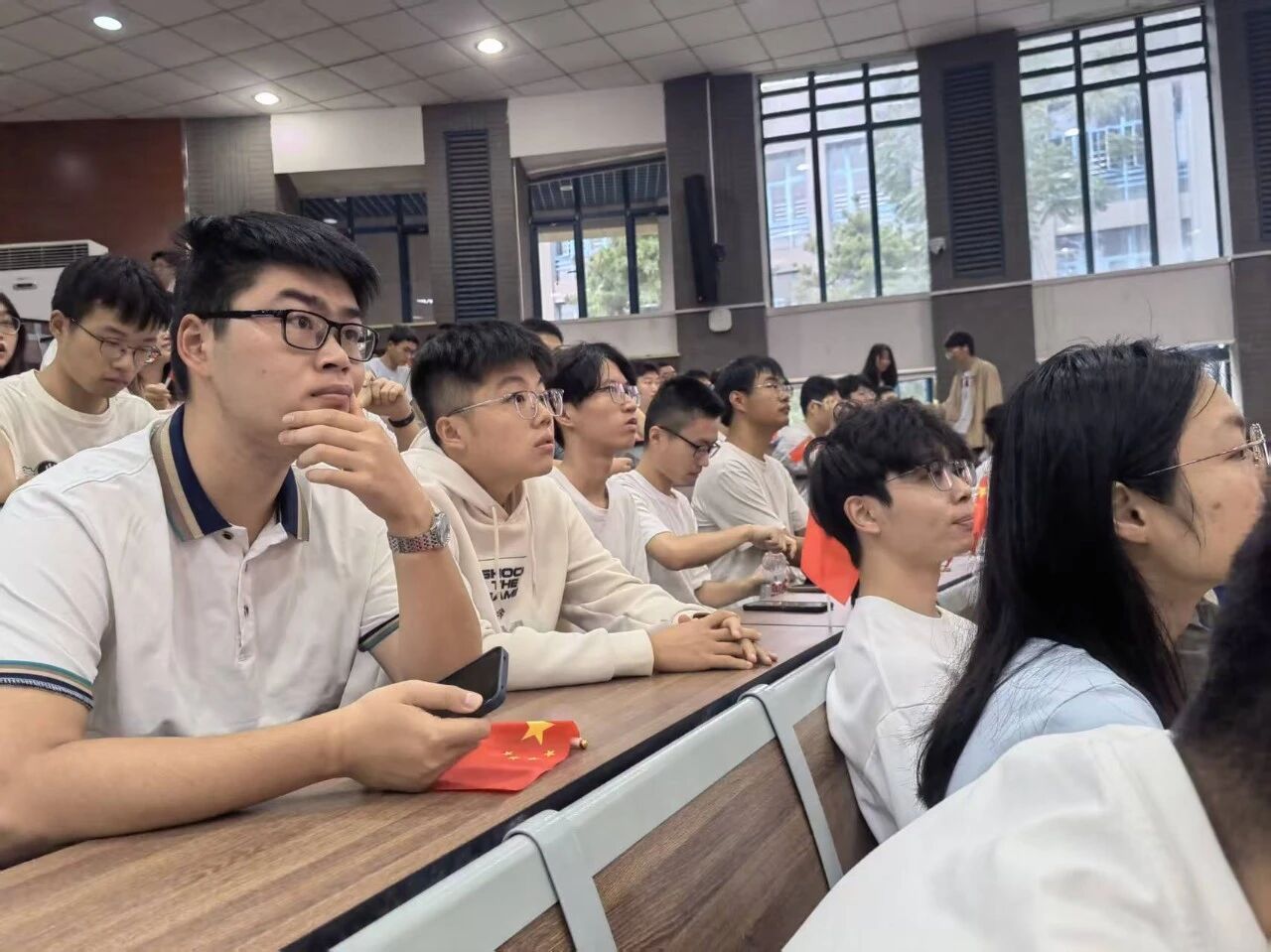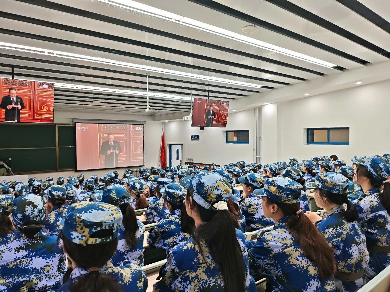 学院领导、师生代表在长安校区海天苑A座航海学院一楼大厅主会场集体收看