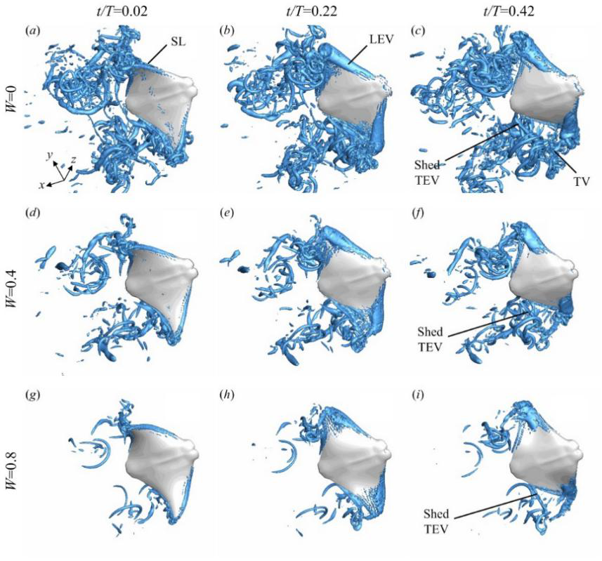 研究团队通过对真实生物的观测得到在游动过程中蝠鲼胸鳍展现出的弦向柔性变形特性,并通过弦向行波方程来模化该复杂变形。在生物游动/飞行过程中,前缘涡被认为有利于高升力的产生,而本文作者通过数值研究创新性的发现鳍尖涡对于胸鳍推进模式推力产生的重要性,以及低速下前缘涡对推力的负影响机制;通过对不同程度弦向变形的模拟发现弦向变形可以有效降低胸鳍的有效攻角,从而降低相关涡结构的强度。蝠鲼正是通过适当的柔性变形使得在不同涡结构的正负影响下,其推力性能达到最优的平衡。本项研究揭示了鳐科生物通过改变胸鳍变形模式增强推力的机制,为仿蝠鲼水下航行器的设计提出了参考性建议。