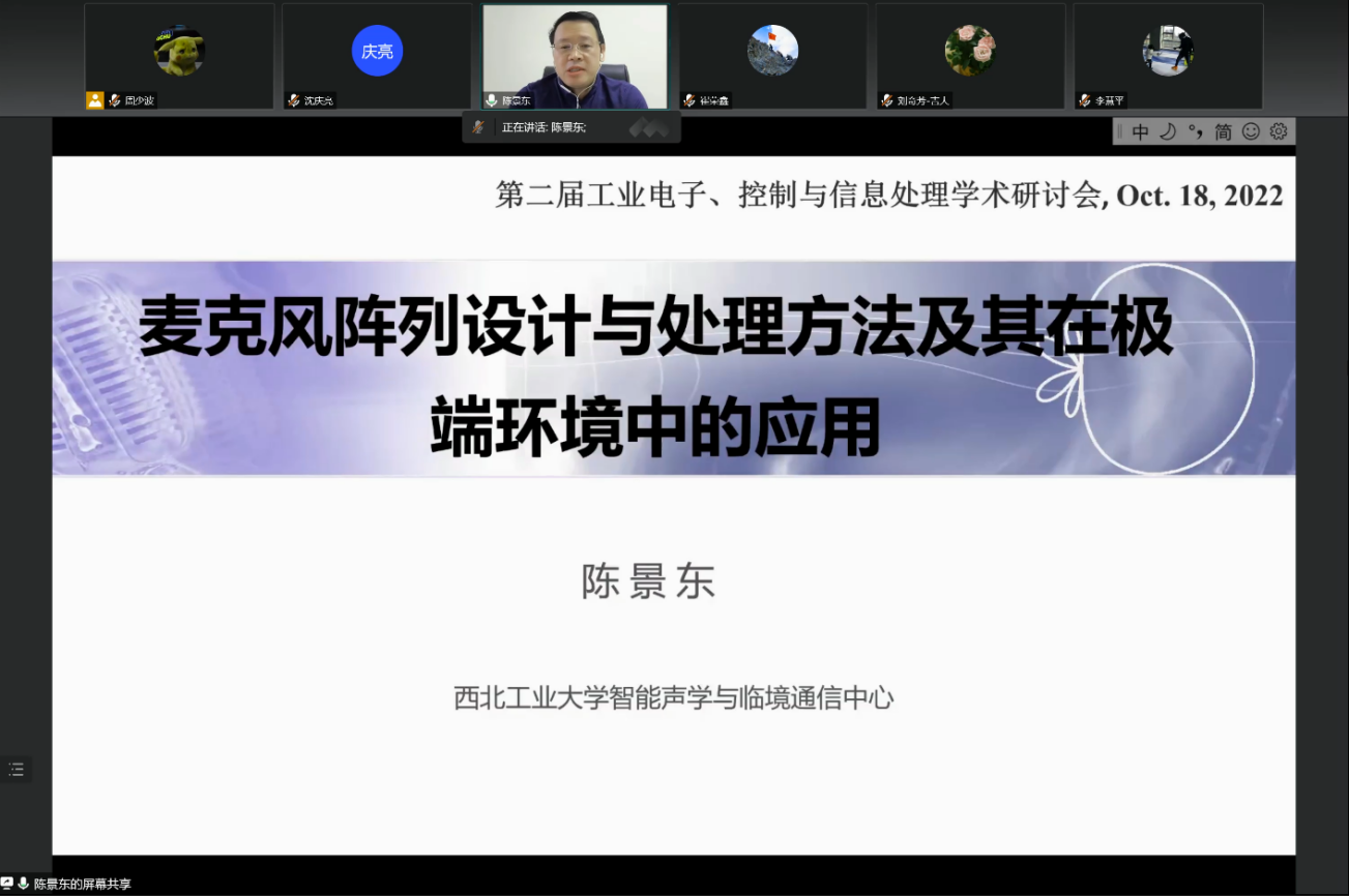 2022年10月18日,“第二届工业电子、控制与信息处理学术研讨会”在西北工业大学举行,受疫情影响,此次会议采用线上直播形式进行。此次会议由中国自动化学会平行控制与管理专业委员会、自动化学会预测控制与智能决策专委会、西北工业大学航海学院、IEEE西安IES Chapter等单位支持举行,由西北工业大学航海学院李慧平教授和崔荣鑫教授主持。来自加拿大维多利亚大学、北京大学、上海交通大学、西北工业大学、国防科技大学和浙江大学等高校的专家以及学生参加了会议。