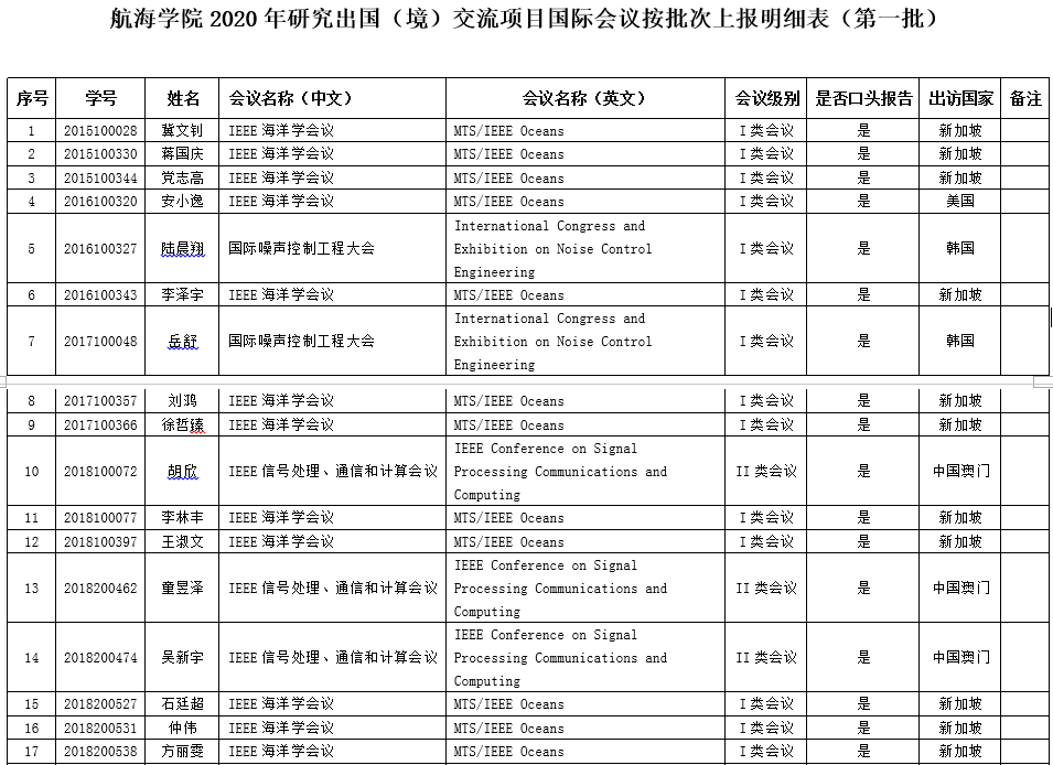 关于公布航海学院2020年研究生出国(境)交流项目国际会议(第一批)受资助学生名单的通知