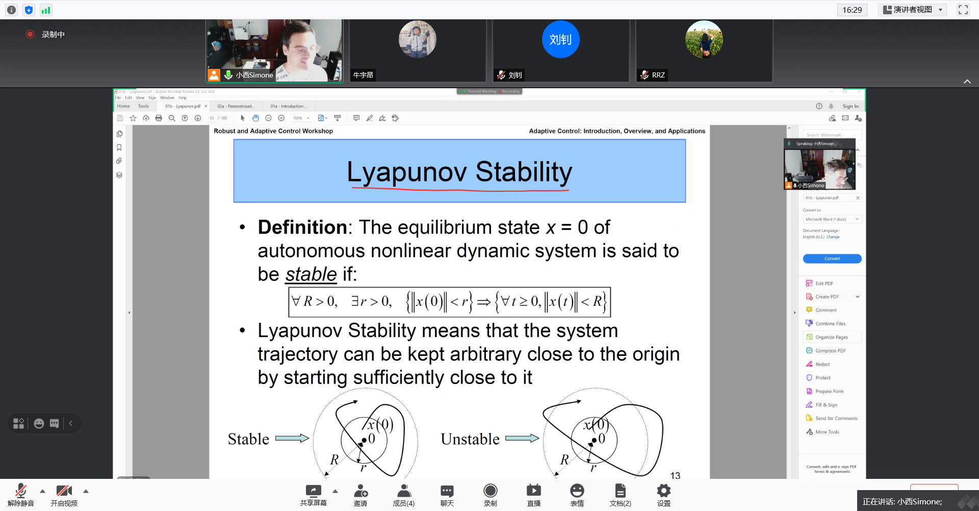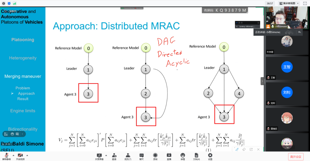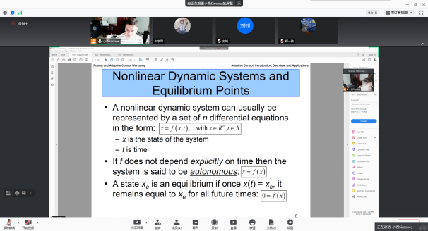 7月19日- 7月29日,应航海学院李乐老师邀请,荷兰代尔夫特理工大学Simone Baldi老师于线上开展自适应控制及应用课程,选课学生一共16人,其中2名本科生,14名研究生,本课程一共16学时,主要讲授自适应控制理论及其应用。介绍自适应控制系统分析和设计的基本理论和方法,包括前期知识,模型参考自适应控制、鲁棒自适应控制、自适应切换控制等;并结合实例介绍自适应控制在无人机路径跟踪、无人车编队保持等无人系统控制问题中的应用。