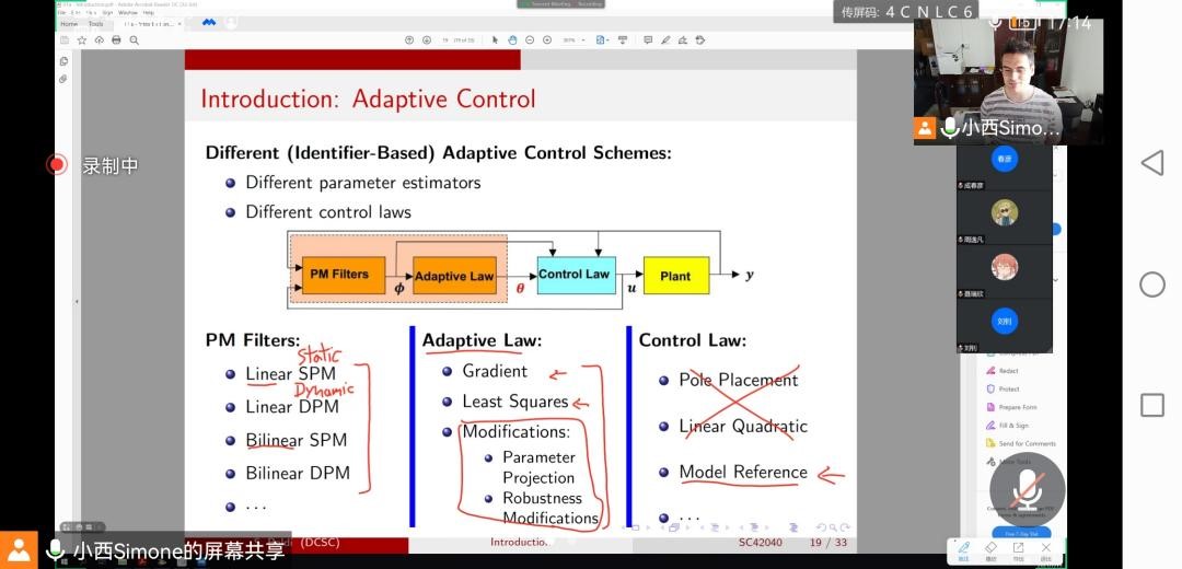 之后的课程从Lypunov定理、建立系统参数模型、不同的参数估计方法、自适应控制率的设计、鲁棒性控制、不同系统的自适应控制策略等方面进行了讲解。为了方便同学们对所学知识有更好的理解和应用,Simone Baldi教授还进行了视频介绍以及simulink仿真演示,最后一节课让同学们做了课堂展示,对自适应控制有了更切实的了解。