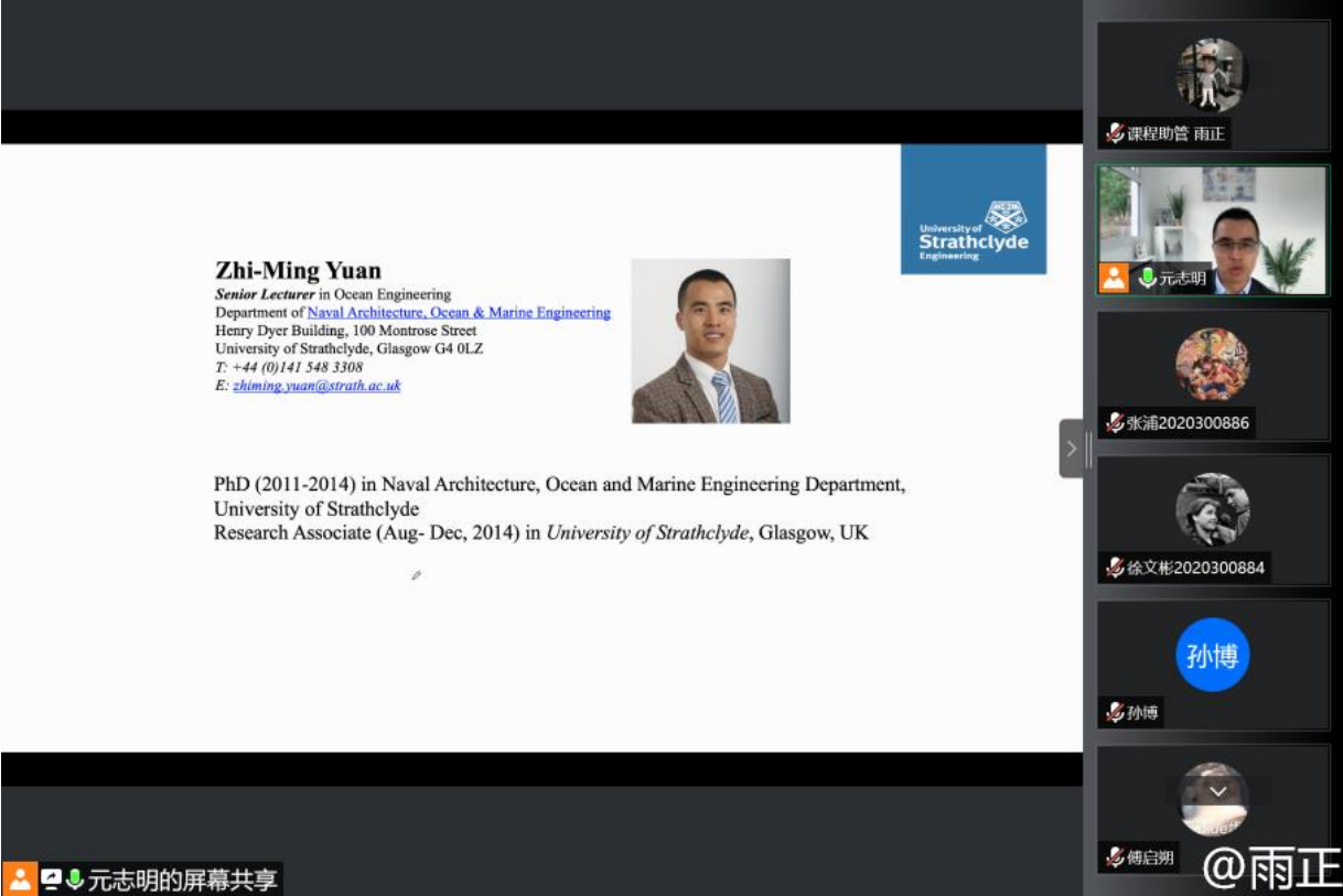 2022年7月4日至7月15日,航海学院暑期国际学堂课程《Dynamics of Ocean Engineering(海洋工程动力学)》顺利开展。课程由来自英国斯克莱德大学的元志明博士授课,课程历时两周,航海学院杜鹏老师为校内联系人。