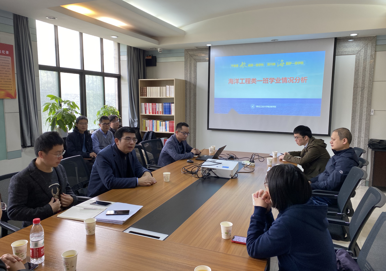 为强化学风建设,带动学生全面成长成才,推进学校“双一流”建设和人才培养质量提升,4月16日上午,航海学院在204会议室召开了海洋工程大类本科生学业分析研讨会。海洋工程大类首席教授、航海学院院长潘光,党委书记孙华强,副院长曾向阳,海洋工程大类本科生2019级辅导员李书磊与2020级辅导员崔晓东,和各级班主任老师参加了会议。会议由曾向阳主持。