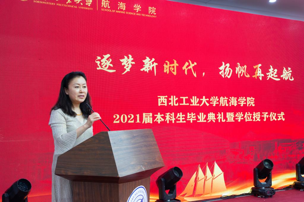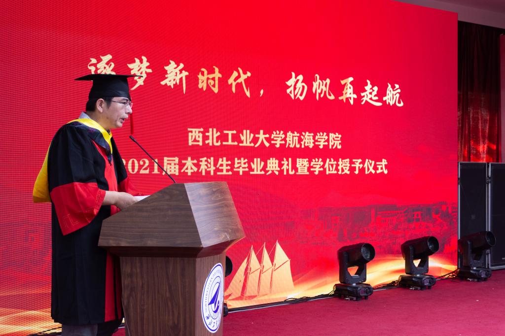 2021年6月28日,航海学院举办了2021届毕业生毕业典礼,院长潘光、书记孙华强、副院长崔荣鑫、曾向阳,副书记王银涛,校友发展基金会副秘书长徐伟霞出席典礼,2017级辅导员杜鹏,学院各专业及方向负责人、教师代表、参加典礼,典礼由曾向阳主持。