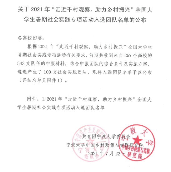 近日,西北工业大学航海学院“苹”凡之力扶贫助农实践队成功入选宁波大学团委、宁波大学中国乡村政策与实践研究院组织的2021年“走近千村观察,助力乡村振兴”全国大学生暑期社会实践专项活动。据了解,前期主办方共收到来自257所高校的543支队伍申报材料。结合申报团队综合条件及实施方案,遴选产生了100支社会实践团队。