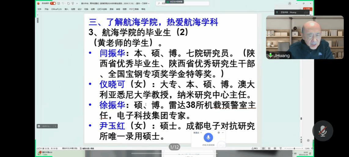 近日,原西北工业大学航海学院院长、银发宣讲员黄建国教授为初入校门的大一新生们带来了一场别开生面、精彩纷呈的讲座。讲座中,黄建国老师深情回顾了前任院长黄震中教授的卓越人生与辉煌成就,并详尽阐述了航海学院的发展历程。此外,黄老师从立大志成大才、怎么学怎么干,以及高标准严要求三个方面,对新生们进行了深入而细致的劝诫与指导。他言辞恳切,寓意深远,为新生们的大学生活和未来发展指明了方向。