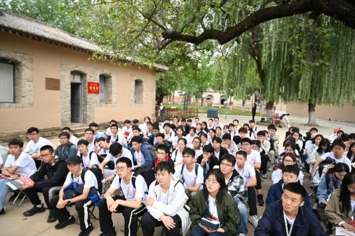 踏暮色而访枣园,仰前辈以悟初心。 暮色渐染之际,实践团队抵达枣园革命旧址,在这片见证中国革命走向胜利的土地上继续追寻红色记忆。枣园革命旧址管理处副主任曹峰以《延安窑洞里面有马列主义》为题开展现场教学,他深情讲述,生动阐释了小小窑洞与中国革命伟业的内在联结,指出这方寸之地正是共产党人革命精神与理论创新的鲜活印记。在五大书记雕像前,师生肃立凝望,感悟伟人风采;步入毛泽东、周恩来曾经工作生活的旧居,朴素的办公桌椅与生活用品静静陈列,无声却有力地诉说着革命家们在艰苦岁月中崇高的精神境界与坚定的理想信念。这段探访让师生对延安精神的内涵有了更为真切的体悟。