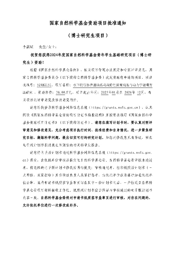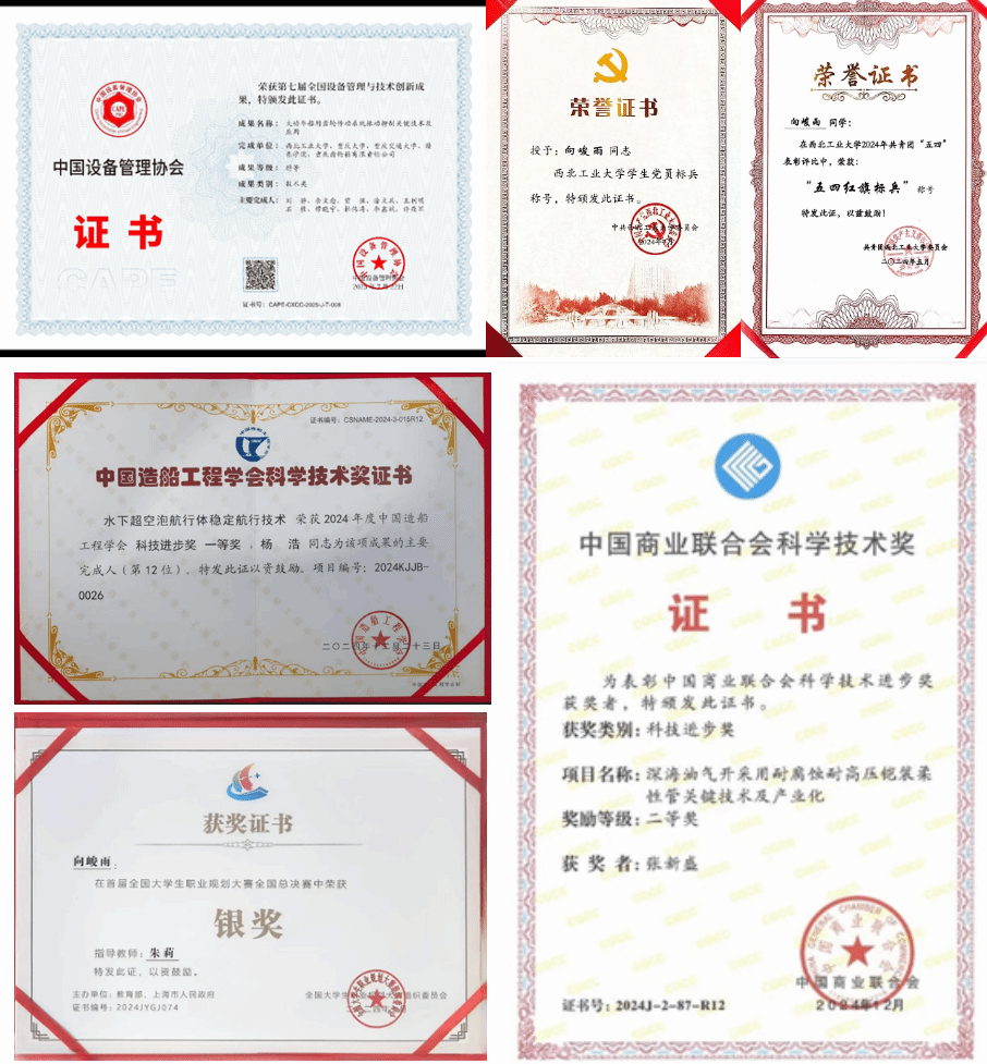 李鑫斌,航海学院2022级兵器科学与技术专业博士研究生,师从刘静教授,研究方向为水下航行器推进系统动力学建模与减振降噪方法研究。连续两年综合测评学院第一、连续三年综合测评专业第一,获得优秀研究生标兵(全校硕博仅10人)、国家奖学金(连续三年)、宝钢优秀学生奖(全校仅5人)、科研价值奖学金、一等奖学金、一等学业奖学金、优秀研究生等。主持国家自然科学基金青年学生基础研究项目(博士研究生)(我校首批,全校仅14人)、西北工业大学博士论文创新基金重点项目;参与多项国家重大科研项目。博士期间在International Journal of Mechanical Sciences,Mechanical Systems and Signal Processing,Journal of Sound and Vibration,Science China Technological Sciences,Nonlinear Dynamics和Ocean Engineering等知名期刊累计发表SCI论文15篇(其中ESI 1%高被引论文3篇,领域权威期刊13篇),EI会议论文2篇,获得中国设备管理协会创新成果奖(9/10,学生第一)、优秀国际会议论文奖,公开/授权国家发明专利5项,主编学术专著1部(排3)。
