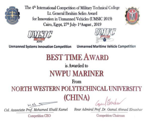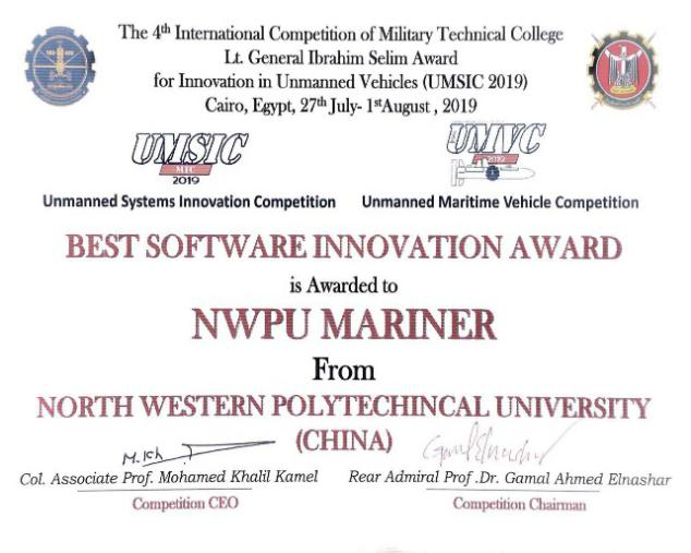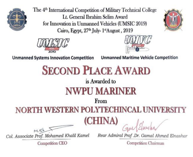 8月1日,UMSIC2019(第四届国际军事无人系统大赛)在埃及开罗落下帷幕。西北工业大学代表队首次参加无人水下平台系统(UMVC)比赛,即从15支参赛队中脱颖而出,勇夺无人水下平台系统(UMVC)比赛第二名。