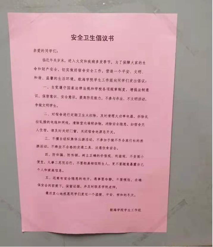 安全是永恒的主题,航海学院持续开展2019级研究生新生校园安全系列专题教育活动,以创建平安校园、和谐航海学院为目标,定期组织集中宣讲、常识内容测试和开展教研室、实验室、宿舍安全专项检查和隐患治理,遵循“遇问题即解决,有隐患即消除”的原则,对发现的安全隐患及时采取防护措施并上报整改,确保专题教育不漏一人、不缺一项,措施落实到位,确保每位学生学习生活环境的安全稳定。