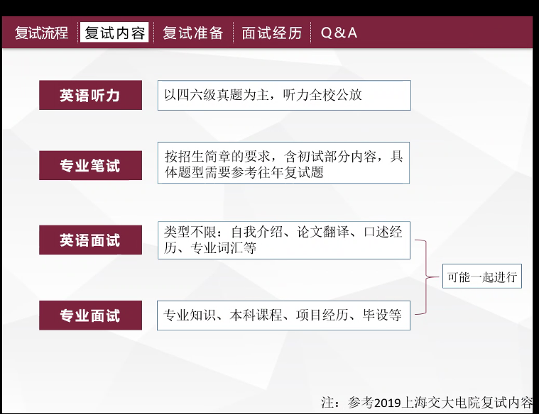 莫冠友学长结合自己报考上海交通大学的经历,从复试流程、复试内容及复试准备三个方面分享了考外校的经验,以上交电院为例对复试通知、复试细节和其他材料的准备进行详细说明,最后总结自己的面试经历,为同学们提出了建议。