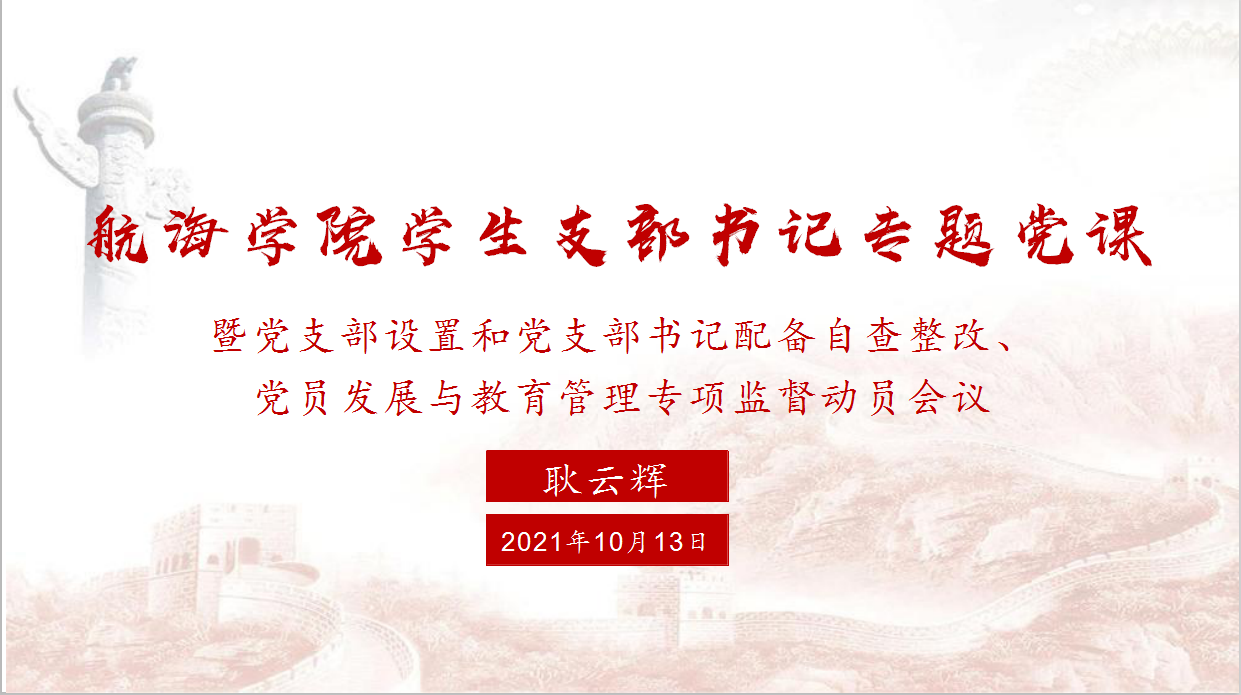 为了深入贯彻落实习近平总书记在党史学习教育动员大会的讲话精神,落实学史明理、学史增信、学史崇德、学史力行,教育引导全党同志学党史、悟思想、办实事、开新局总要求。结合航海学院学生党支部配置创新改革实际,推进学生党支部设置和党支部书记配备自查和整改,以及学生党员发展和教育管理情况专项督查等工作有效落实,进一步提高学生党支部书记的党务工作能力,带动支部组织建设高水平发展,2021年10月13日,航海学院在长安校区实验大楼516开展学生党支部标准化规范化建设培训会,会议由航海学院院长助理耿云辉主持,学院专职辅导员李书磊,各学生党支部书记及部分支委参加会议,部分人员通过腾讯会议线上参会。