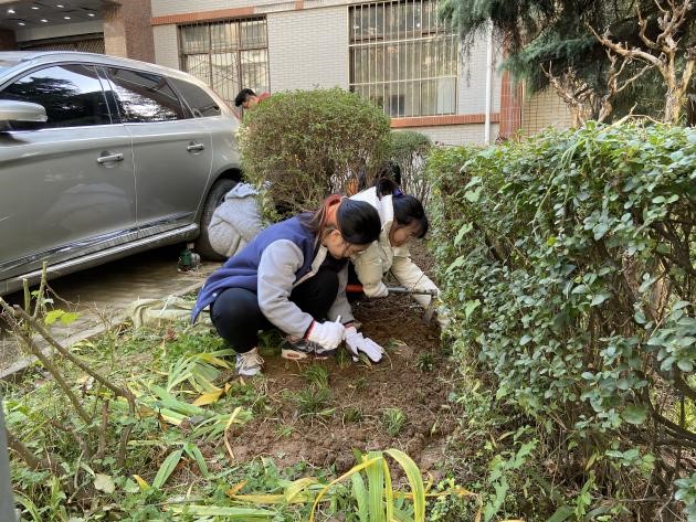 麦冬草根系发达,耐旱,适应性强,是园林绿化地被植物的首选品种,可做地被植物使用,可在河坡、路边、树穴、石缝、墙角、花坛边缘、绿篱脚下等处正常生长。首先在相关技术人员的指导下,志愿者们学习了相关麦冬草的种植要领,保证种植深度在5-10cm,种植间隔在10-15cm。经过专业人士的演示,同学们跃跃欲试。在几次尝试后就能熟练地掌握种植要领,经过辛勤劳作,同学们留下了滴滴汗水,也浇灌了亲手种植的麦冬草园地。大家在实践中培养了热爱劳动与劳动人民的情感,更深入体会了劳动的伟大意义。