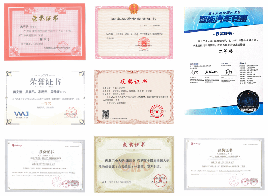 宋玥兵学习态度端正,作风踏实严谨。主修自动控制原理、现代控制理论、非线性控制、最优估计与卡尔曼滤波、机器学习与智能控制等课程。大学英语四级621分、六级619分,均一次性通过。获国家奖学金、校级一等奖学金、校级二等奖学金、吴亚军三等奖学金。