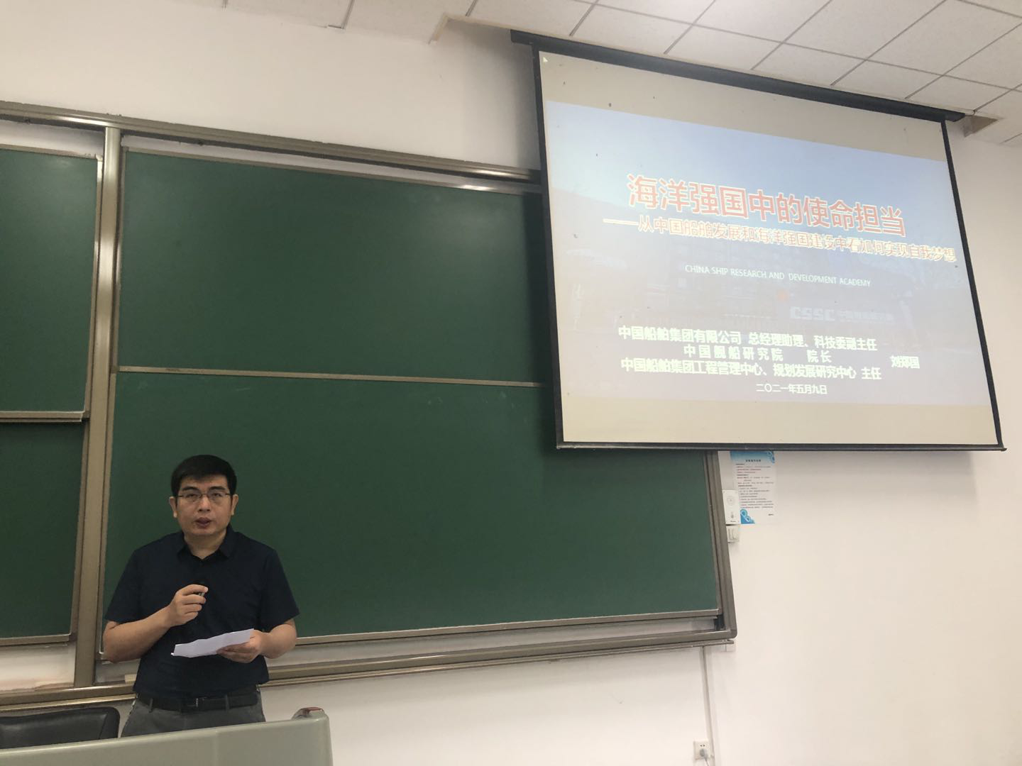 “感悟深蓝”课程第一讲于2021年5月9日上午10:30,在长安校区教西D106教室开讲,由杰出校友、航海学院86届毕业生、中国十大杰出青年、中国舰船研究院院长刘郑国授课,2020级二百余名学生聆听了主题为《海洋强国中的使命担当——从中国船舶发展和海洋强国建设中看如何实现自我梦想》的讲座。航海学院曾向阳副院长在课前介绍了“感悟深蓝”课程的设立目的,并详细介绍了刘郑国的个人事迹。