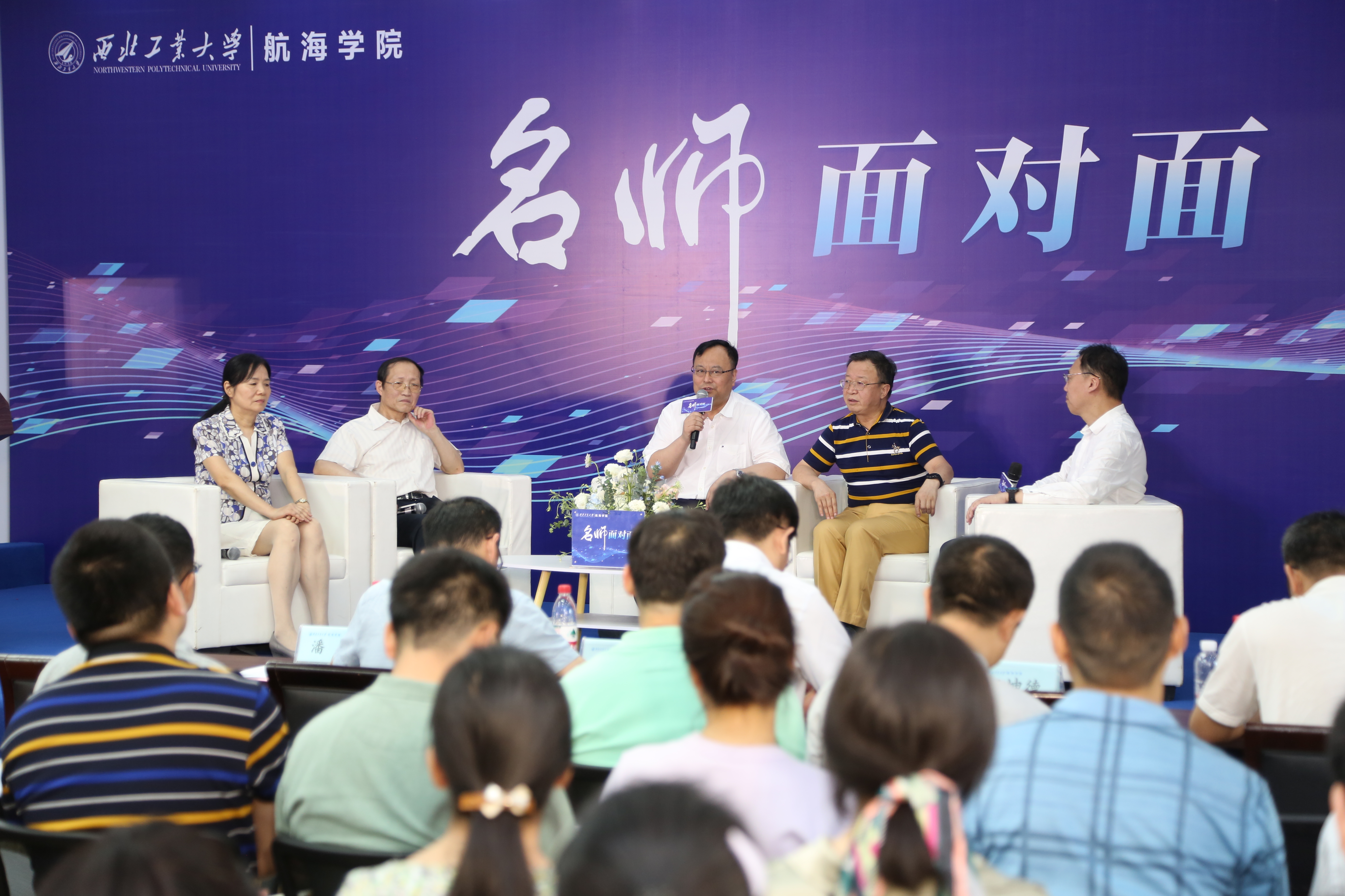 访谈正式开始,潘光结合教育部出台的《深化新时代教育评价改革总体方案》、西北工业大学一流本科人才培养行动计划30条就一流课程如何建设、思政教育如何融入日常教学工作、如何提高生源质量、教师评价“破五维”应当注意哪些问题等方面与名师们进行了充分的交流和访谈,现场气氛热烈,时不时响起热烈的掌声。