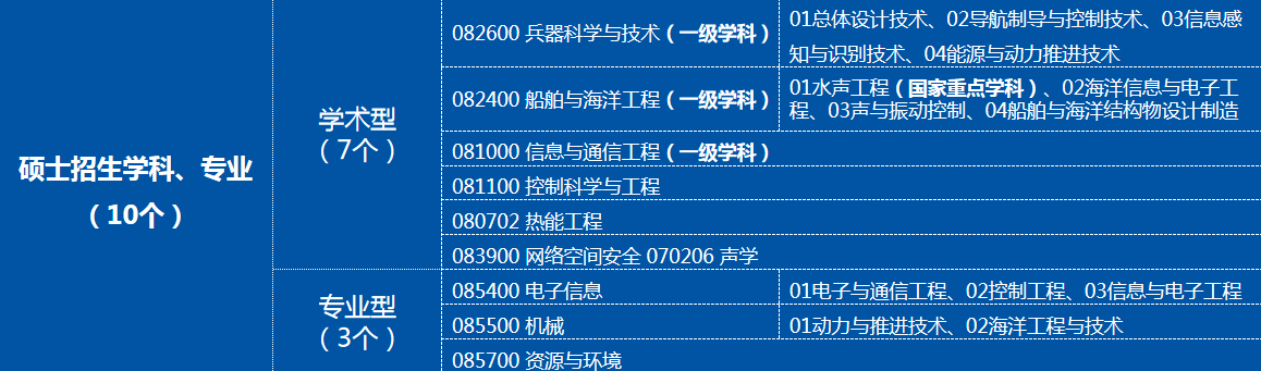 航海学院硕士招生学科专业10个(7学术型、3个专业型)、博士招生学科专业6个,设兵器科学与技术、船舶与海洋工程、信息与通信工程3个一级学科博士学位授权点和声学、网络空间安全2个二级学科博士学位授权点,其中武器系统与运用工程和水声工程是国家重点学科。