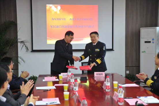 随后,海军潜艇学院朱海教授简单介绍了此次合作协议的内容,由航海学院院长潘光与王宇院长签署合作协议。海军潜艇学院院长王宇少将高度评价了西北工业大学的办学成就和航海学院近些年来举得的巨大成果,他表示此次签约合作在海军潜艇学院发展进程中具有重大意义,学院将借助航海学院的智力资源和人才优势进一步提升和发展。