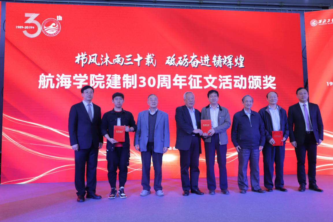 大会最后一项,举行纪念建制30周年征文活动颁奖仪式。由潘光院长宣读本次征文活动获奖名单,由李保义书记、马远良院士、徐德民院士为获奖教师、院友、学生代表颁奖并合影留念。本次征文共收到稿件190余篇,评选出一等奖19项、二等奖38项、三等奖23项,共57篇征文收录于纪念建制30周年文集——《碧海潮声》中。